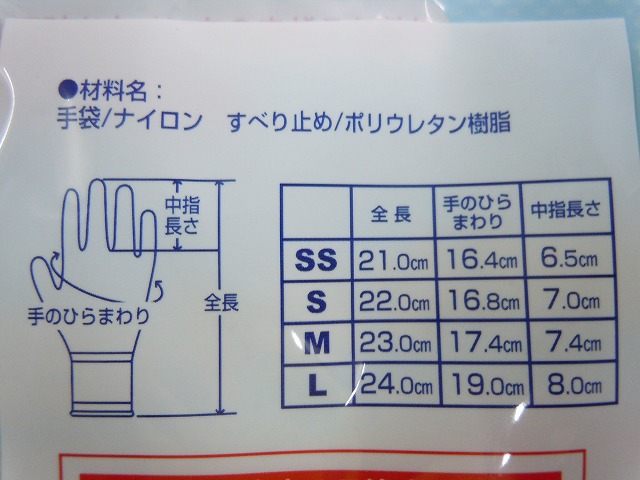 材料・・・手袋:ナイロン すべり止め:ポリウレタン樹脂 サイズ・・・SS、S、M、L