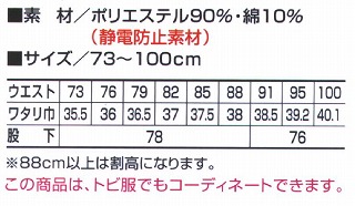 シルエットもゆったり。 ツータックですので太ももにゆとりができ、動きやすいです。 シャツやベストとの組み合わせも自在です。 トビ服でもコーディネートできます。 ポリエステル90%・綿10% (帯電防止素材) サイズ73cm〜100cm ※カラーについては実店舗で取り扱っているものを掲載しています。 他の色でもメーカーより取り寄せできる色もありますので問い合わせください。 シロ・クロは162円高 91・95・100は162円高 になりますのでご了承願います。 |