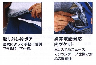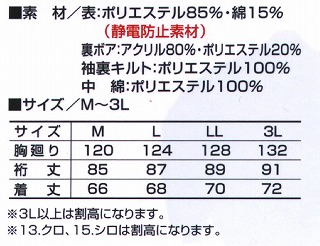 寒い冬に大活躍。衿のボア使い、袖・裾のフライスが寒さを完璧にシャットアウト。 表:ポリエステル85%・綿15% (帯電防止素材) 裏ボア:アクリル80%・ポリエステル20% 袖裏キルト:ポリエステル100% 中綿:ポリエステル100% サイズ M〜3L ※カラーについては実店舗で取り扱っているものを掲載しています。 他の色でもメーカーより取り寄せできる色もありますので問い合わせ下さい。 シロ・クロは162円高 3Lは162円高 になりますのでご了承願います。 |