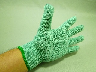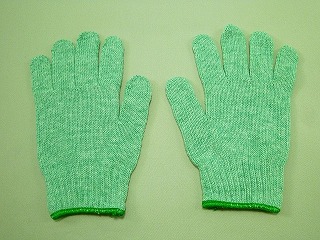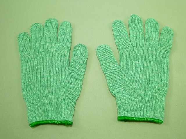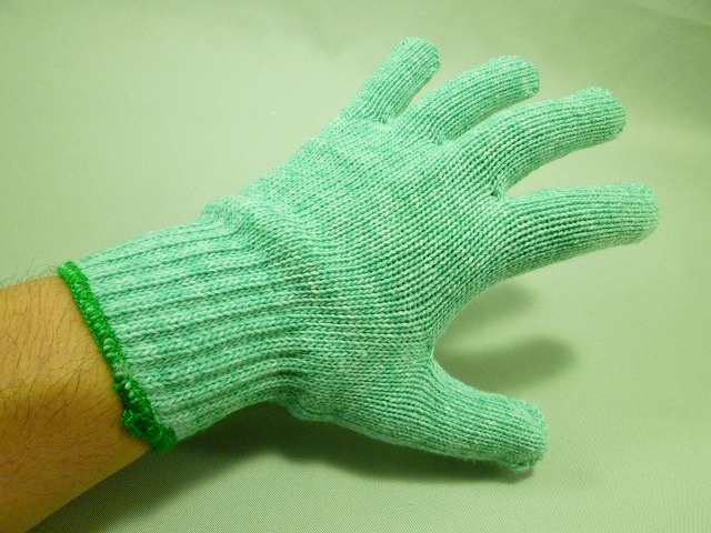グリーンに色染めした特紡糸で編んであります。ナイロン軍手ではありません。手芸にも適しています。 10デカ(100双) 6、600円(税込) 1デカ(10双)あたり 660円 8.5番の特紡糸 2本 約500g/デカ 手首のロックの色・・・グリーン