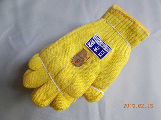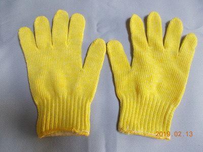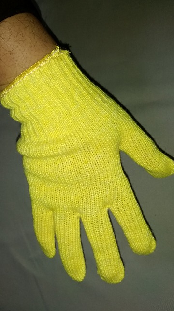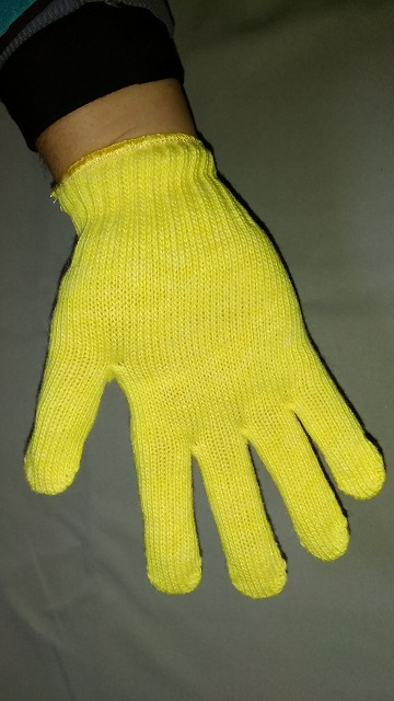 黄色に色染めした特紡糸で編んであります。ナイロン軍手ではありません。手芸や運動会にも適しています。